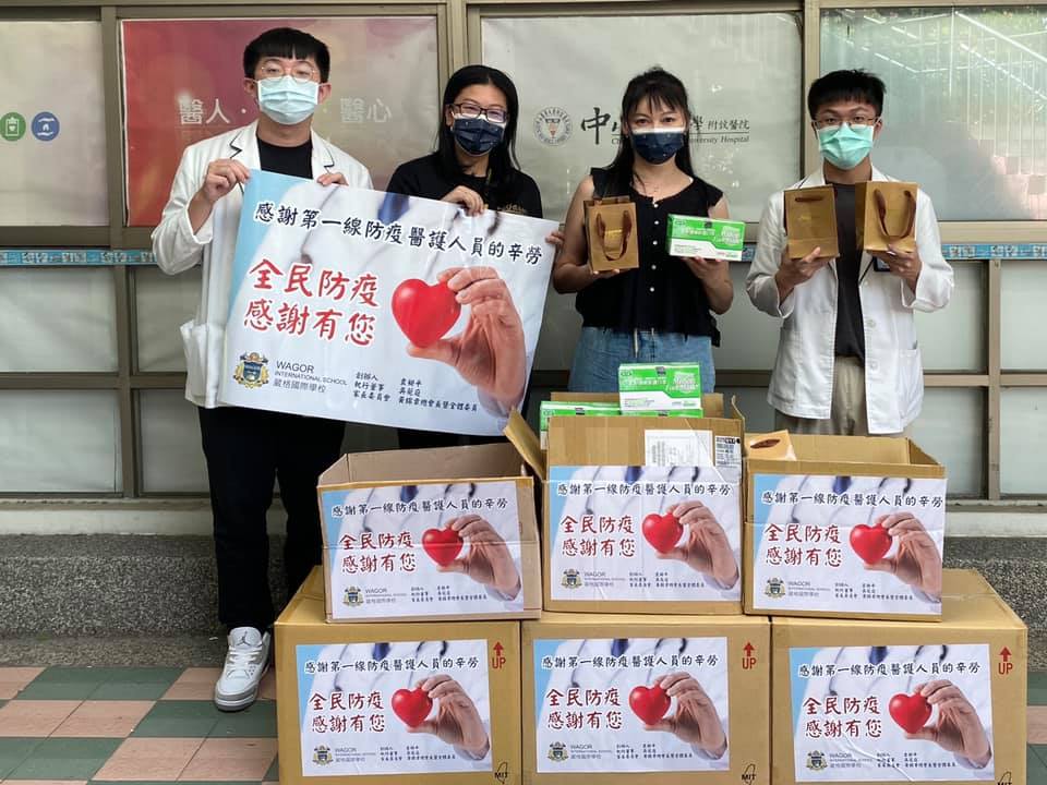 疫情逐漸趨緩,辛苦的醫護人員功不可沒,我們將感謝化為行動,集結葳格國際學校家長會、寶麗金餐飲集團 的力量,黃錦章總會長、國中部翁芸芸會長、小學部西屯校區黃怡仁會長、小學部北屯校區陳利旻會長、多位副會長、常委與委員共同捐贈,我們共同製作十幾萬片醫療口罩、購置防疫物資與製作營養健康港式餐盒,口罩除了贈送給防疫期間辛苦的老師們,也為勞苦功高的醫護人員獻上小小心意。